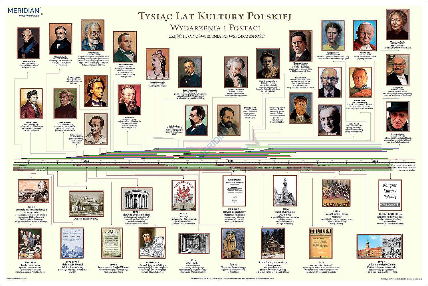 Ścienna plansza szkolna przedstawiająca najważniejsze wydarzenia, postaci oraz unikalne dzieła polskiej kultury na przestrzeni tysiąclecia. Część druga przedstawia epoki: oświecenie, romantyzm, pozytywizm, Młoda Polska, XX-lecie międzywojenne, sztuka współczesna. Całość naniesiona jest na oś czasu.