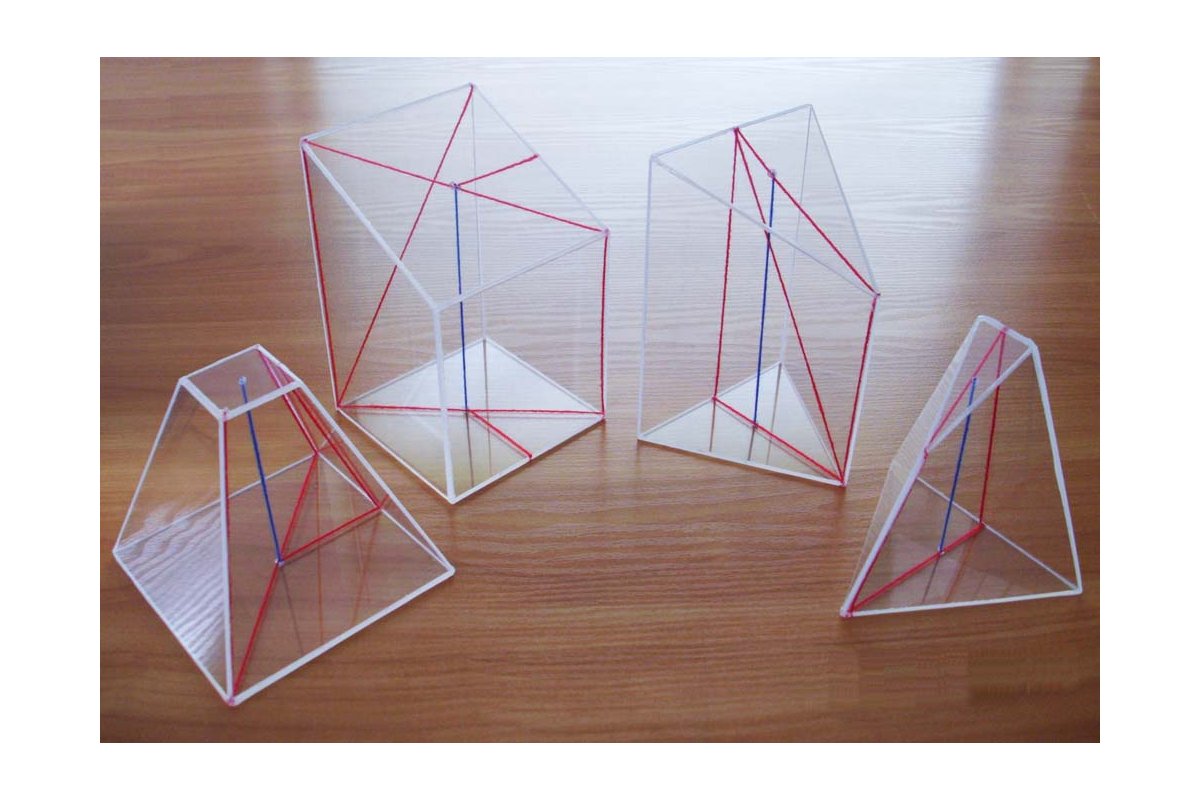 Zestaw 4 brył geometrycznych, wykonanych z przeźroczystego tworzywa sztucznego z zaznaczonymi wysokościami i przekątnymi.