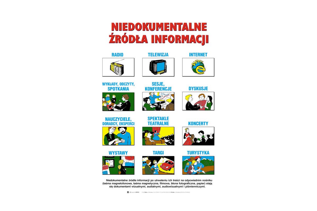 Zestaw tablic dydaktycznych w formacie 50×70 cm o następująych tytułach: 1. Dzieje mediów, cz. I. 2. Dzieje mediów, cz. II. 3. Dzieje mediów, cz. III. 4. Zbiory biblioteczne. 5. Rodzaje encyklopedii. 6. Rodzaje słowników. 7. Budowa książki. 8. Układ treści książki. 9. Układ treści czasopisma (gazety). 10. Niedokumentalne źródła informacji. 11. Ogólnokrajowa sieć biblioteczna. 12. Warsztat informacyjny biblioteki szkolnej. 13. Wzór karty katalogowej książki. 14. Karta katalogowa książki (hasło autorskie). 15. Karta katalogowa książki (hasło tytułowe). 16. Uniwersalna klasyfikacja dziesiętna. 17. Budowa katalogu rzeczowego wg UKD. 18. Podział literatury pięknej w bibliotekach dla dzieci i młodzieży. 19. Opis bibliograficzny książki. 20. Opis bibliograficzny fragmentu książki. 21. Opis bibliograficzny artykułu w czasopiśmie. 22. Poszukiwanie informacji w bibliotece. 23. Źródła informacji o książce i innych mediach. 24. Warsztat pracy umysłowej ucznia.