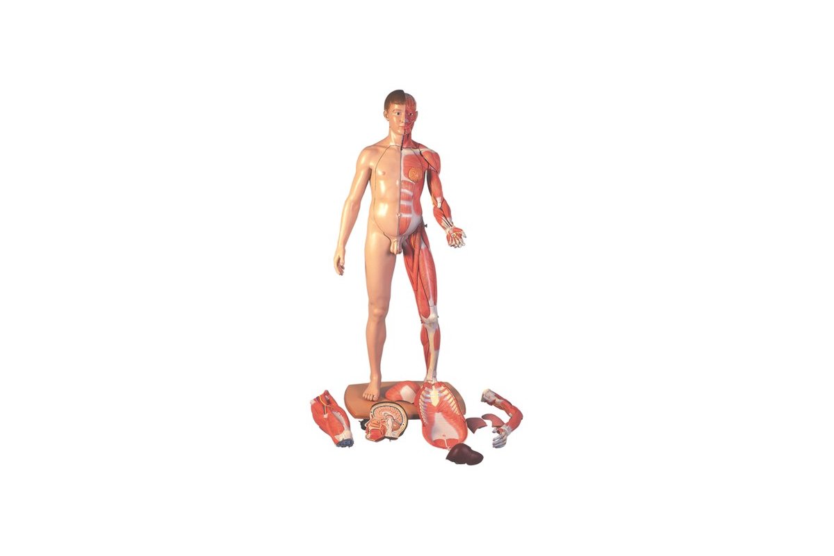 Naturalnej wielkości, dwupłciowy model mięśniowy, 39-częściowy. - prawa połowa modelu pokazuje naturalne ciało - lewa – powierzchniowe i głębiej położone mięśnie z nerwami, naczyniami i strukturą kostną. - 2-częściowa głowa - połowa mózgu - mięsień mostkowo-obojczykowo-sutkowy - 6-częściowa ręka ( odłączalna ): · Mięsień naramienny · Mięsień dwugłowy ramienia · M. trójgłowy ramienia · M. dłoniowy długi z m. zginacz promieniowy nadgarstka, z m. ramienno-promieniowym z m. prostownik promieniowy nadgarstka.