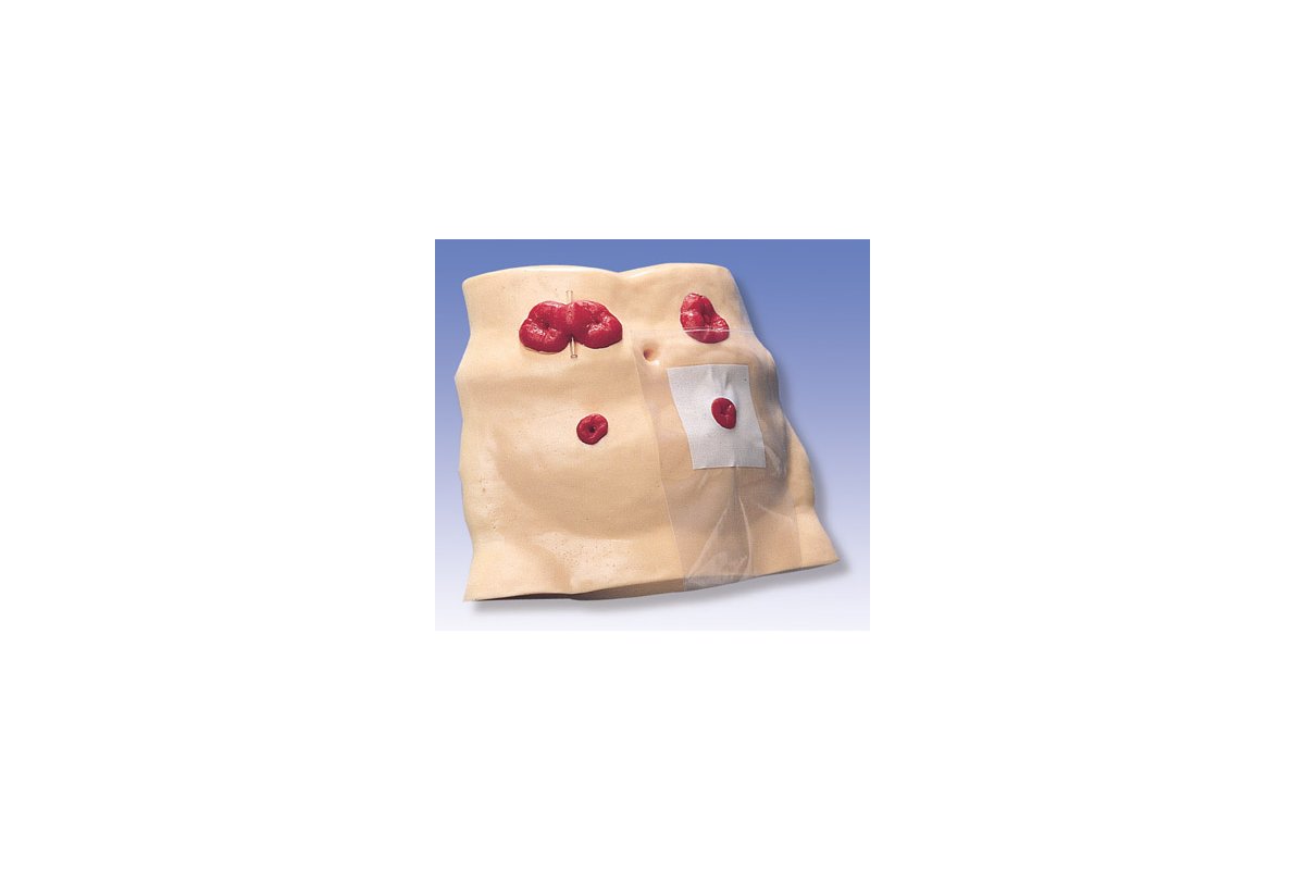 Model zawiera cztery stomie, które po nasmarowaniu można rozszerzać za pomocą palca. Na modelu można ćwiczyć przemywanie, przyklejanie przylepców opatrunkowych, bandażowanie lub zakładanie worków stomijnych. Model dostarczany ze środkiem smarującym. Wymiary: 33 x 46 cm. Nr katalogowy: W43027.