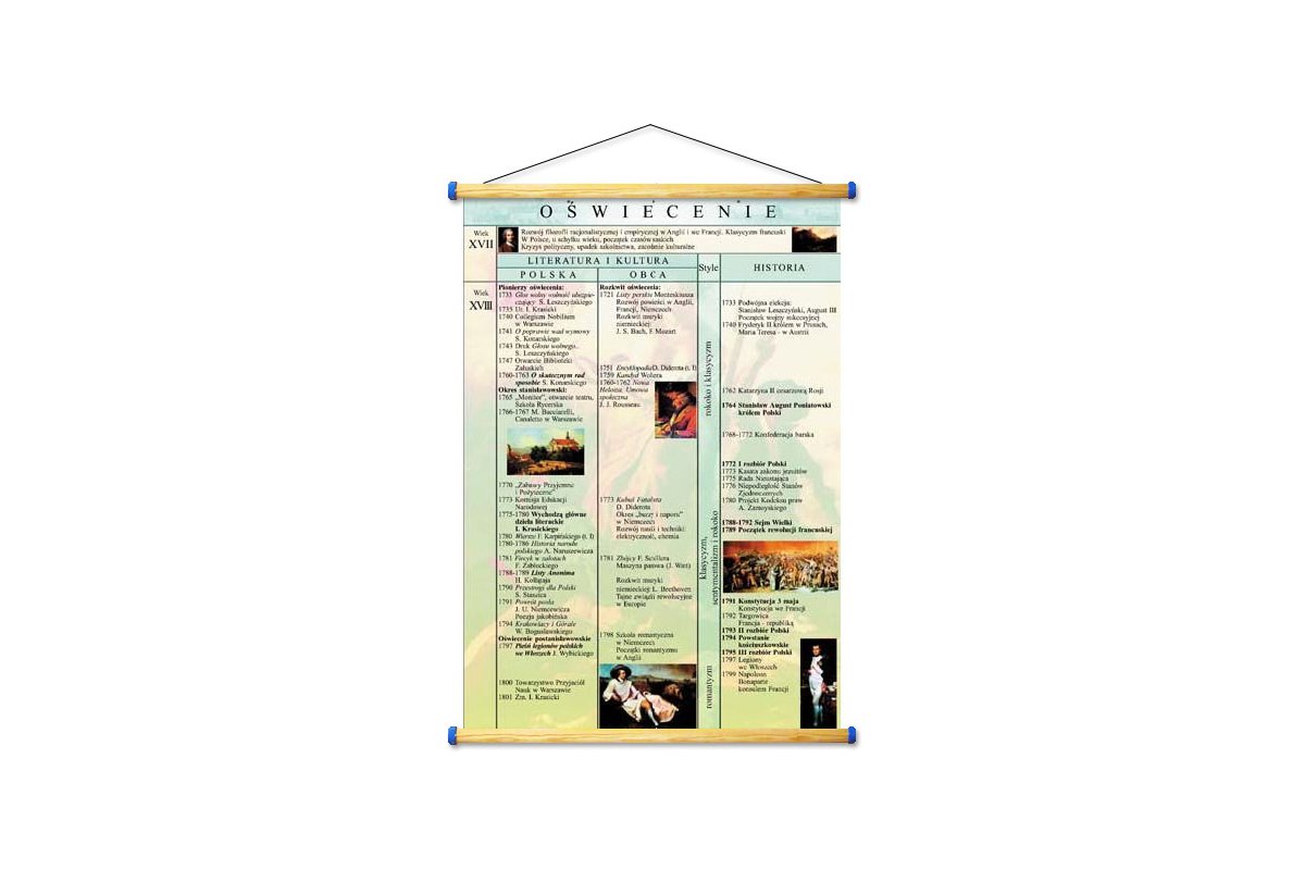 PLANSZA OPRAWIONA W NOWYM SYSTEMIE OPRAW Plansza oprawiona jest w półwałki drewniane w systemie tzw. WDS. Różnica w porównaniu do opraw tradycyjnych, polega na tym iż półwałki - skręcane są tu metalowymi wkrętami a ich końce wykończone /zakładanymi na gorąco/ specjalnymi nie spadającymi zatyczkami. Na górnym półwałku analogicznie jak przy mapach zamocowane są dwie linki: 1. zawieszającą umożliwiająca demonstrowanie rozwiniętej planszy 2. wiążącą służy do związywania planszy w celu jej przechowywania ew. przenoszenia w stanie zwiniętym ZALETY OPRAWY WDS Planszę z łatwością można wielokrotnie zwijać i rozwijać jak mapę. Bezpiecznie przechowywać, przenosić /przewozić/. oszczędzając przy tym powierzchnię magazynowania. Zatyczki zakładane na gorąco /nowość w tym systemie opraw/ - nie spadają, albowiem są dodatkowo skręcane wzdłużnie a ponadto: 1. uniemożliwiają przypadkowy rozpad półwałków w więc pełnią rolę wzmacniającą oprawę 2. zapobiegają zabrudzeniu końcówek wałków przy ich wielokrotnym zwijaniu i rozwijaniu 3. stanowią estetyczne wykończenie planszy Plansza efektownie prezentuje się zarówno na ścianie jak i na trójnogu wieszaku do map a także na edukacyjnej listwie szybkiej prezentacji z którą dodatkowo współgra wykończeniem. DANE TECHNICZNE Format: 70 cm x 100 cm po rozwinięciu. Druk wg najwyższych standardów dla wydawnictw wielkoformatowych w 1 ark. wydawniczym nie klejony. Pokrycie, folia wzmacniająca błysk, nadająca efektowny połysk. Folia zawiera filtr UV opóźniający proces - płowienia kolorów. Powierzchnia planszy, jest zmywalna, dzięki czemu łatwo ją utrzymywać w czystości, a co istotne można po niej pisać flamastrami wodno zmywalnymi nanosząc dodatkowe objaśnienia lub inne dydaktyczne akcenty.
