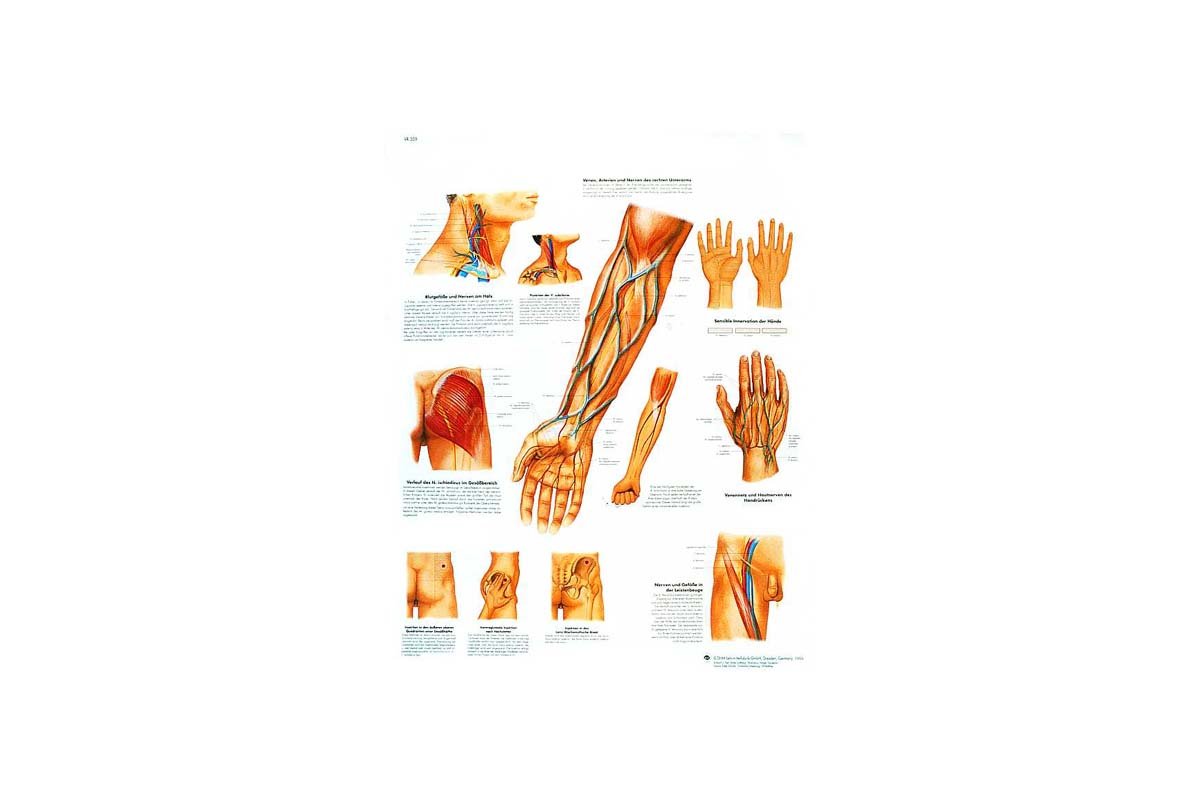 Przebieg ważnych klinicznie naczyń i nerwów. Plansza wykonana na papierze kredowym, oprawiona w listewki plastikowe. Wymiary: 50x67 cm.