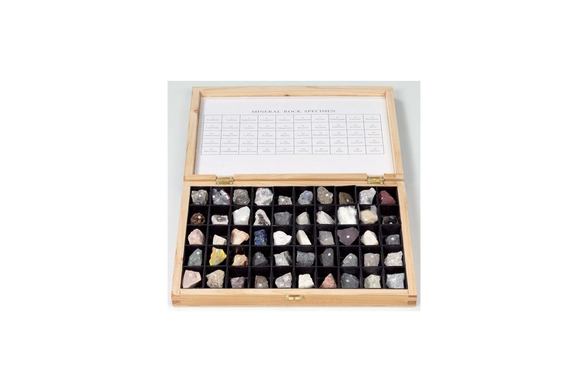 Zestaw 50 skał i minerałów do pierwszych geologicznych ćwiczeń. Każdy oznaczony jest kodem, a całość umieszczona w skrzyneczce