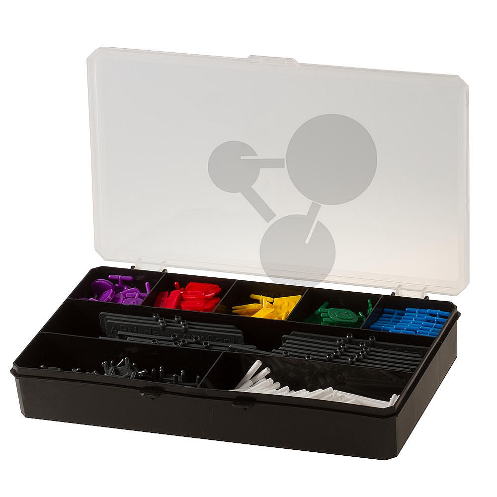 Zawartość zestawu: 24 zasady A, 24 zasady T, 24 zasady C, 24 zasady G, 24 zasady U (tylko do kwasu rybonukleinowego), 108 elastycznych elementów łącznikowych, 16 transportujących kwasów rybonukleinowych (struktura antykodonu), 40 aminokwasów (2 serie po 20). Bardzo łatwy w zastosowaniu i dobrze prezentujący się. Zestaw umożliwia poznawanie: DNA, budowy kodu genetycznego (schematyczne przedstawienie cząsteczki) – par zasad – struktury podwójnego heliksu – komplementarności zasad – replikacji DNA (rozrywanie wiązań i otrzymywanie 2 cząsteczek DNA, które do siebie pasują a więc są identyczne) – syntezy informacyjnego kwasu rybonukleinowego począwszy od obu cząsteczek DNA – kodonu: jednostki sekwencji DNA – syntezy białek począwszy od informacyjnego kwasu rybonukleinowego. Plastik, z którego wykonano elementy jest szczególnie wytrzymały na złamania i charakteryzuje się szczególnymi właściwościami odkształcania. Właściwość ta pozwala zachować taki kąt pomiędzy wiązaniami, aby przedstawić podwójną helisę DNA. To odkształcenie jest odwracalne.
