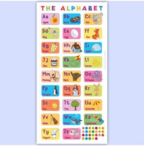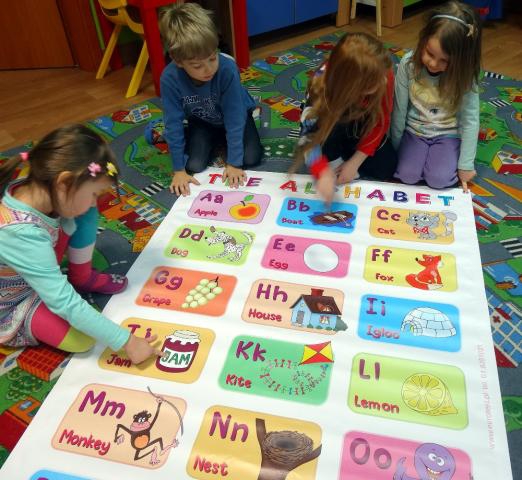 Nauczyciel włącza płytę z muzyką lub sam śpiewa angielski alfabet, równocześnie przeskakuje na poszczególne pola maty edukacyjnej np. nauczyciel śpiewa A (ej), B (bi), C (si) i podczas śpiewania poszczególnych głosek znajduje się na konkretnym polu z literą. Nauczyciel prosi chętne dzieci o przejście całej maty tym samym sposobem, który on chwilę wcześniej pokazał.W tym czasie reszta dzieci, siedząca w kole na dywanie śpiewa angielski alfabet.
