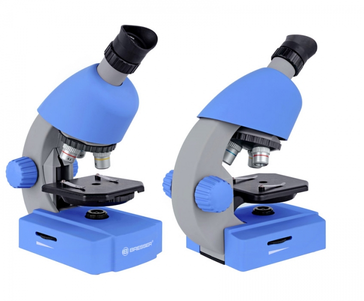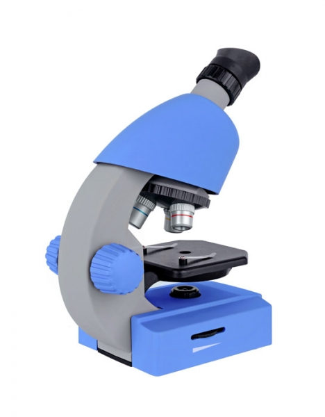 Korpus mikroskopu pokryty niepoślizgowym tworzywem w kolorze niebieskim.