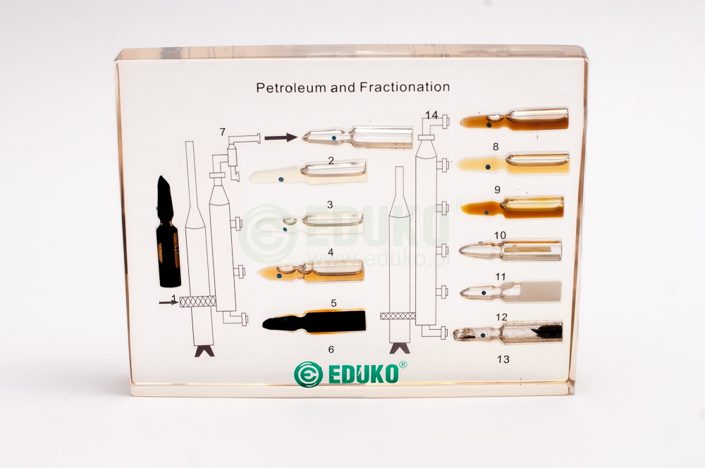 Preparat firmy EDUKO zawiera nieduże próbki ropy naftowej i jej pochodnych powstałych podczas destylacji w instalacjach CDU/VDU (destylacji atmosferycznej i próżniowej). W przejrzystej pleksi znalazły się próbki ukazujące ropę naftową i jej pochodne a łączące próbki schematy ukazują nie tylko podczas której destylacji powstały przetworzone produkty ale też relatywną lotność destylatów.