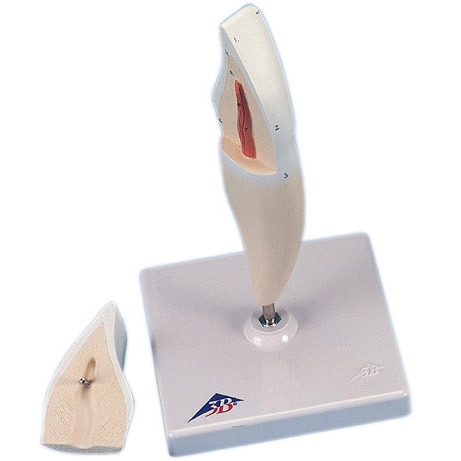 Dwuczęściowy dolny siekacz jest pokazany w przekroju podłużnym. Dolny siekacz jest odwzorowaniem zęba dorosłego człowieka.