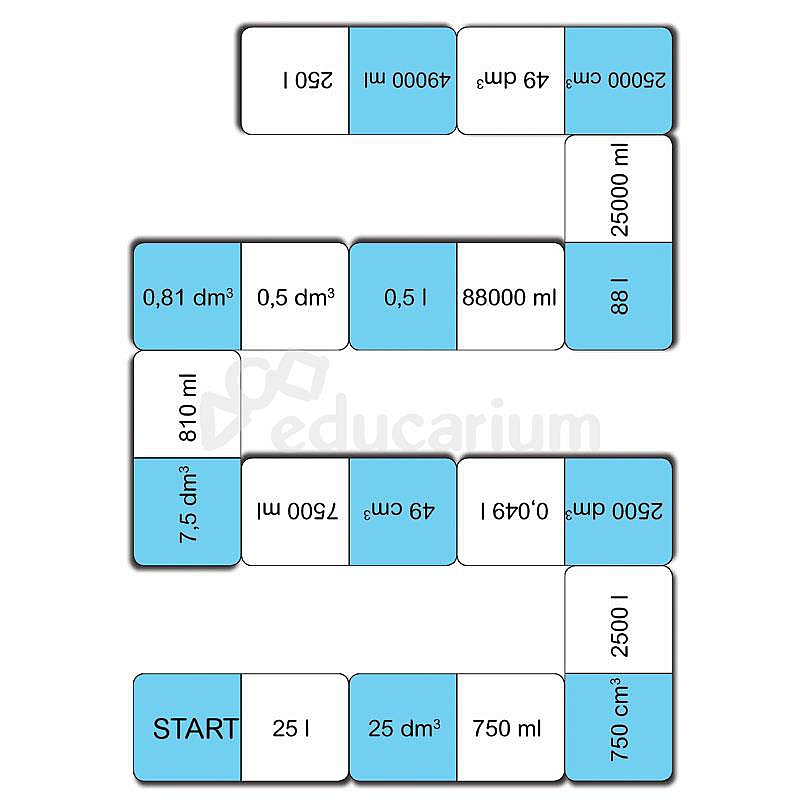 Każde domino poświęcone jest kolejnym jednostkom miar: długości, wag, powierzchni i objętości. Uwzględniono wyłącznie te jednostki, których znajomość wymagana jest przez nową podstawę programową do nauki matematyki w klasach 4-8 szkoły podstawowej. Uczniowie w atrakcyjny sposób utrwalają utrwalają umiejętność stosowania przeliczników pomiędzy poszczególnymi jednostkami miar.