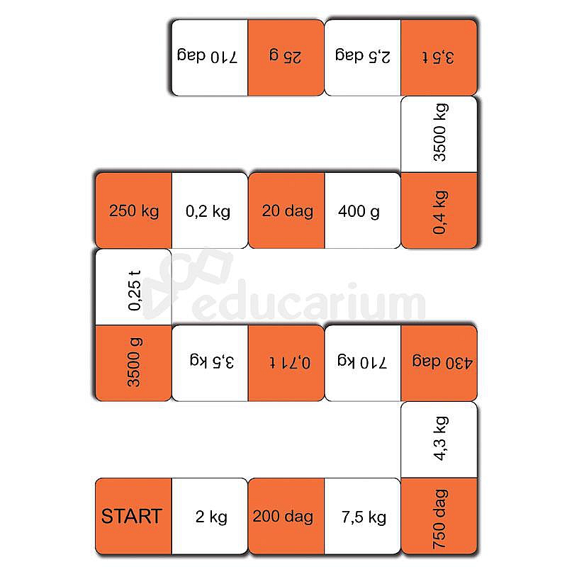 Każde domino poświęcone jest kolejnym jednostkom miar: długości, wag, powierzchni i objętości. Uwzględniono wyłącznie te jednostki, których znajomość wymagana jest przez nową podstawę programową do nauki matematyki w klasach 4-8 szkoły podstawowej. Uczniowie w atrakcyjny sposób utrwalają utrwalają umiejętność stosowania przeliczników pomiędzy poszczególnymi jednostkami miar.