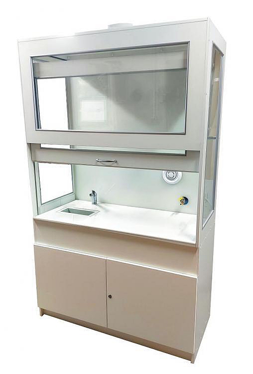 W górnej komorze zamocowana jest przesuwana okiennica podnoszona za pomocą systemu „Fennel”. Pozwala on na ustawienie okiennicy (góra-dół) w dowolnym położeniu. Wentylator z płytą montażową stanowi wyodrębnioną część wyciągu do montażu na otworze kominowym. W standardzie wentylator kanałowy o mocy 350-500 m3/h dwubiegowy. W wersji wzbogaconej fragment instalacji wyciągowej narażonej na bezpośrednie działanie oparów szkodliwych jest wykonana z kształtek i kanałów kwasoodpornych. Króciec wyciągowy na suficie fi 150mm. Dygestorium posiada system wentylacji wywiewny. Całość na nośniku płyty laminowanej. Nóżki regulacyjne niewidoczne z zewnątrz, umożliwiają wypoziomowanie urządzenia. Dygestorium jest dostępne w trzech kolorach: biały, buk, popiel. Dodatkowe kolory na specjalne zamówienie.
