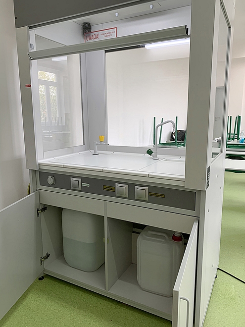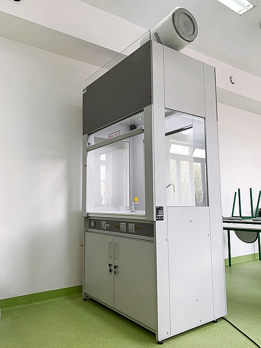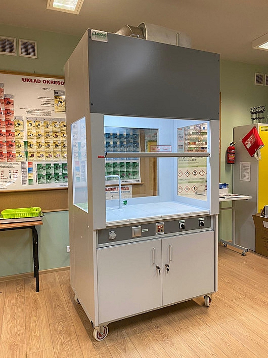Dygestorium szkolne nie wymagające podłączania do wentylacji oraz wykonania w pomieszczeniu przyłączy dopływu wody i odpływu ścieków (wod-kan.). Idealne do klas, w których jest problem z przygotowaniem tych instalacji.