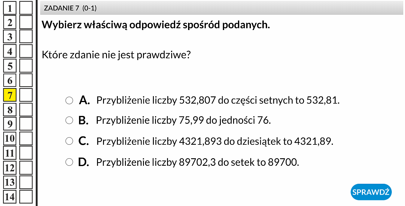 Program obejmuje 8 interaktywnych testów, skonstruowanych zgodnie z wymaganiami podstawy programowej. Każdy test zawiera 14 zadań, w tym różnorodne zadania zamknięte - pojedynczy wybór, wielokrotny wybór, prawda-fałsz. Zagadnienia obejmują działania na liczbach naturalnych, całkowitych, ułamkach zwykłych i dziesiętnych, obliczenia procentowe, wyrażenia algebraiczne, potęgi, pierwiastki, równania, geometrię, a także elementy statystyki opisowej.