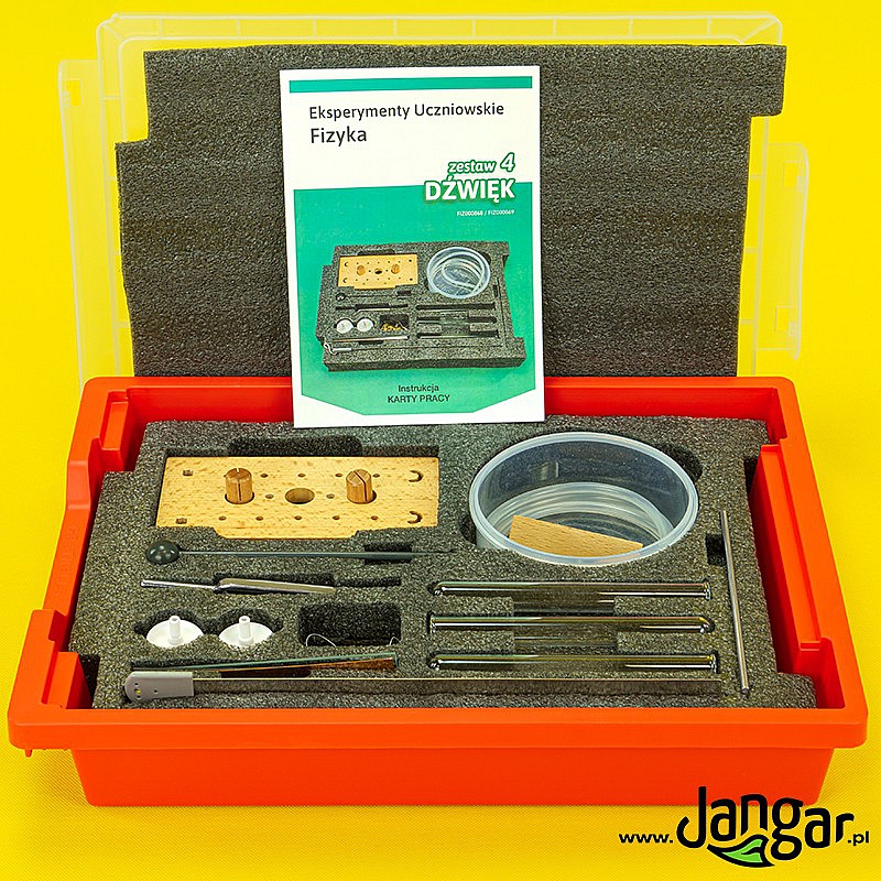 Zestaw nr 4 serii Eksperymenty uczniowskie FIZYKA umożliwiający przeprowadzenie kilkunastu eksperymentów z zakresu dźwięku i fal zgodnie z dołączonymi kartami pracy zawartymi w dołączonej instrukcji.