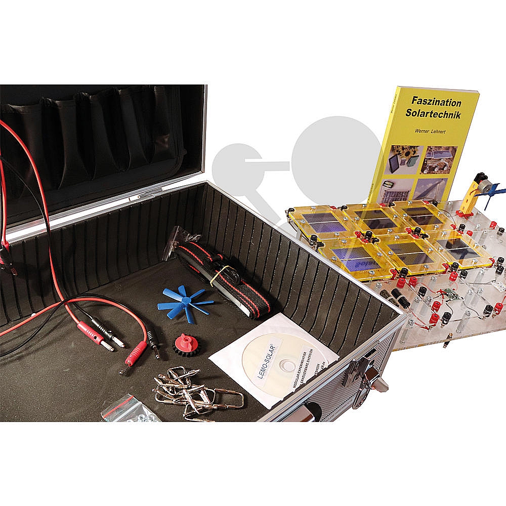 Aluminiowa walizka 450 x 320 x 145 mm, modułowa płyta wtykowa 425 x 295 mm z akcesoriami, 6 modułów ogniw słonecznych, 1 modułowy silnik solarny, 1 moduł kondensatory złote, 1 moduł regulacji jasno/ciemno, 1 moduł z 2 diodami LED , 1 moduł LED SMD, 1 moduł z silnikiem silnik solarny / turbina / generator wiatrowy, 10 mostków, 1 mostek z diodą zabezpieczającą przed rozładowaniem, po 1 przewodzie połączeniowym CZERWONY/CZARNY 450 mm, 300 mm, 250 mm, 200 mm, 24 nakrętki do mocowania modułów, instrukcja w j. niemieckim na CD.