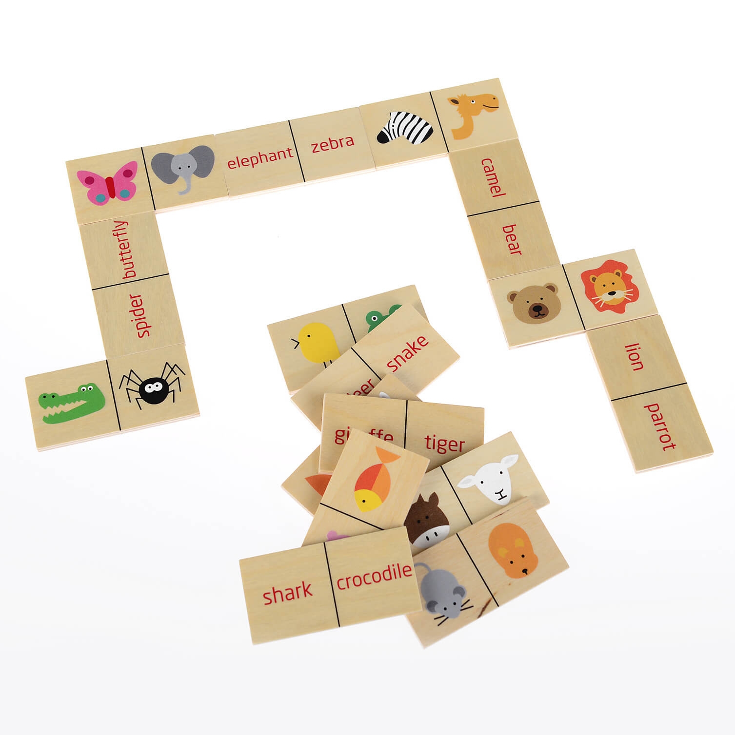 Domino z serii English Eater w prosty i przyjemny sposób zapozna Twoje dziecko z angielskimi słówkami. Kostki domina są dwustronne: z jednej strony są obrazki zwierząt domowych, a z drugiej zwierząt egzotycznych. Zasady zabawy przypominają tradycyjną grę: każdy uczestnik losuje z kartonika określoną liczbę płytek, a następnie – w ramach swojej kolejki – stara się dopasować klocek do tego leżącego na stole. I oczywiście – jak najszybciej pozbyć się wszystkich swoich elementów. Różnica polega na tym, że zamiast określonej liczby oczek na płytkach znajdują się rysunki zwierzątek i ich angielskie nazwy. Maluch musi ze sobą połączyć obrazek i odpowiadający mu wyraz.