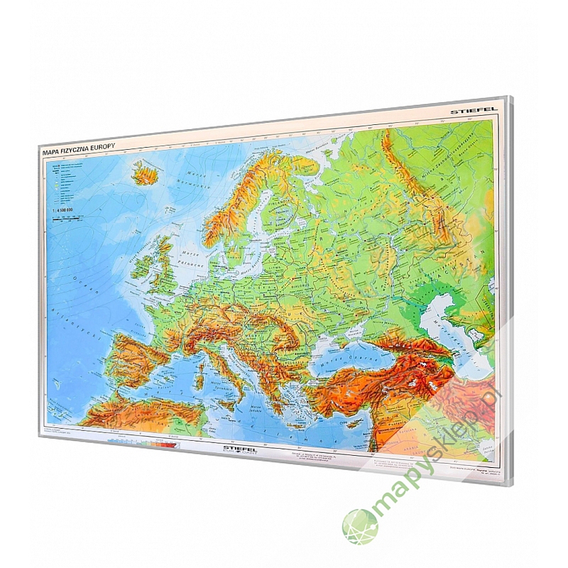 Mapa fizyczna Europy na korku do wpinania wydawnictwa Stiefel. Mapa jest oprawiona w aluminiową ramę z narożnikami z tworzywa. Możliwość zaznaczania na mapie punktów szpilkami lub chorągiewkami. Podkład do wpinania oparty na technologii wielowarstwowej ułatwiającej wpinanie i utrzymanie znaczników w odpowiednim miejscu. Produkt bardzo dobrej jakości, wykonany z należytą precyzją i starannością.
