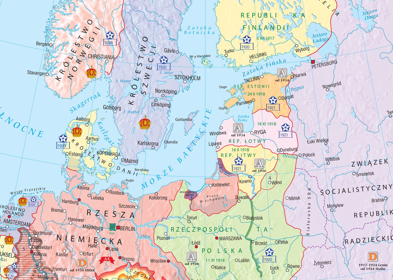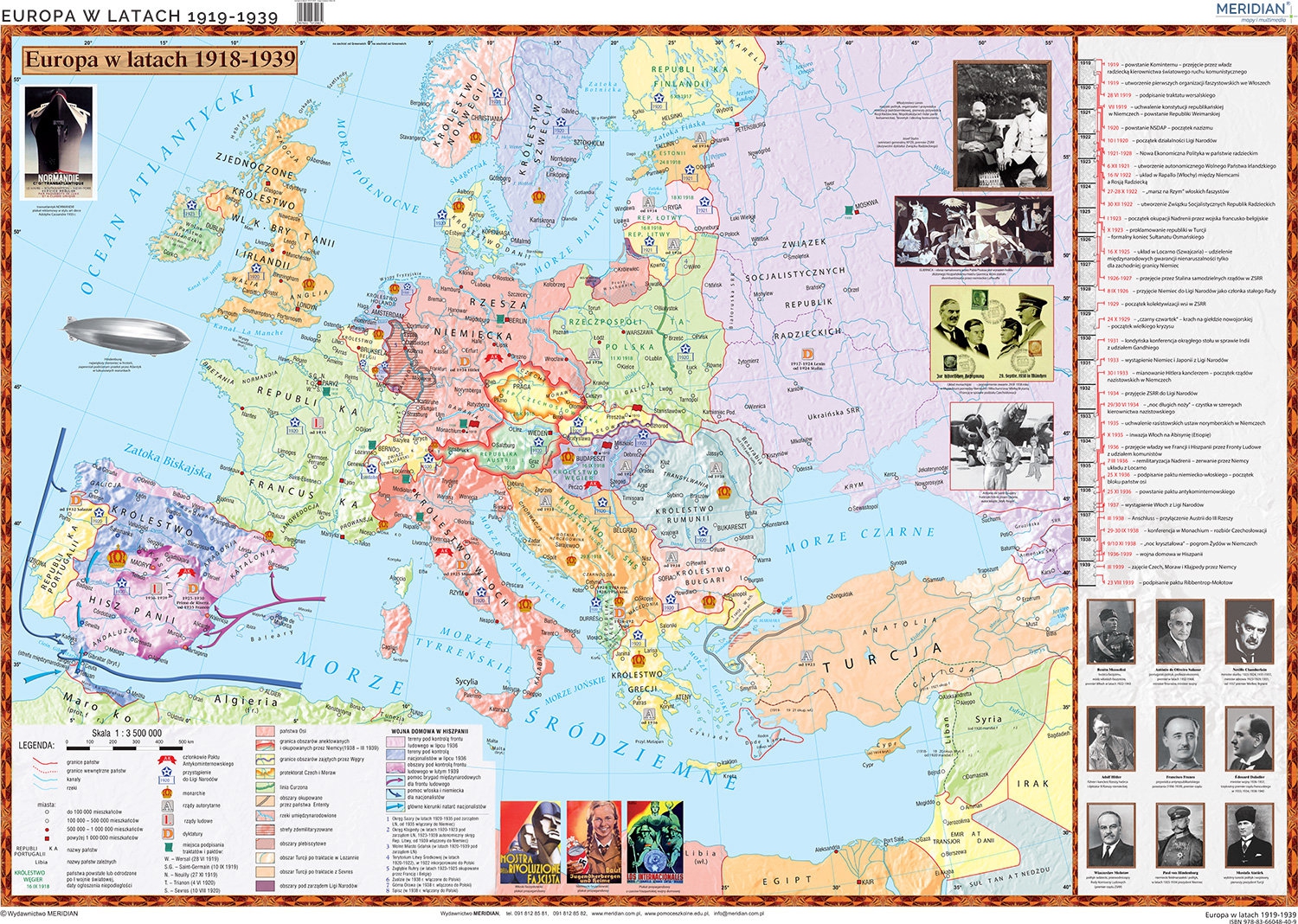 Mapa przedstawia podział polityczny i sytuację międzynarodową w Europie dwudziestolecia międzywojennego z uwzględnieniem państw powstałych lub odrodzonych po I wojnie światowej. Państwa rozróżnione są według kryterium panującego w nich systemu sprawowania władzy: monarchie, rządy autorytarne, ludowe oraz dyktatury. Mapa pokazuje narodziny i rozwój faszyzmu, a także przebieg i główne wydarzenia hiszpańskiej wojny domowej.