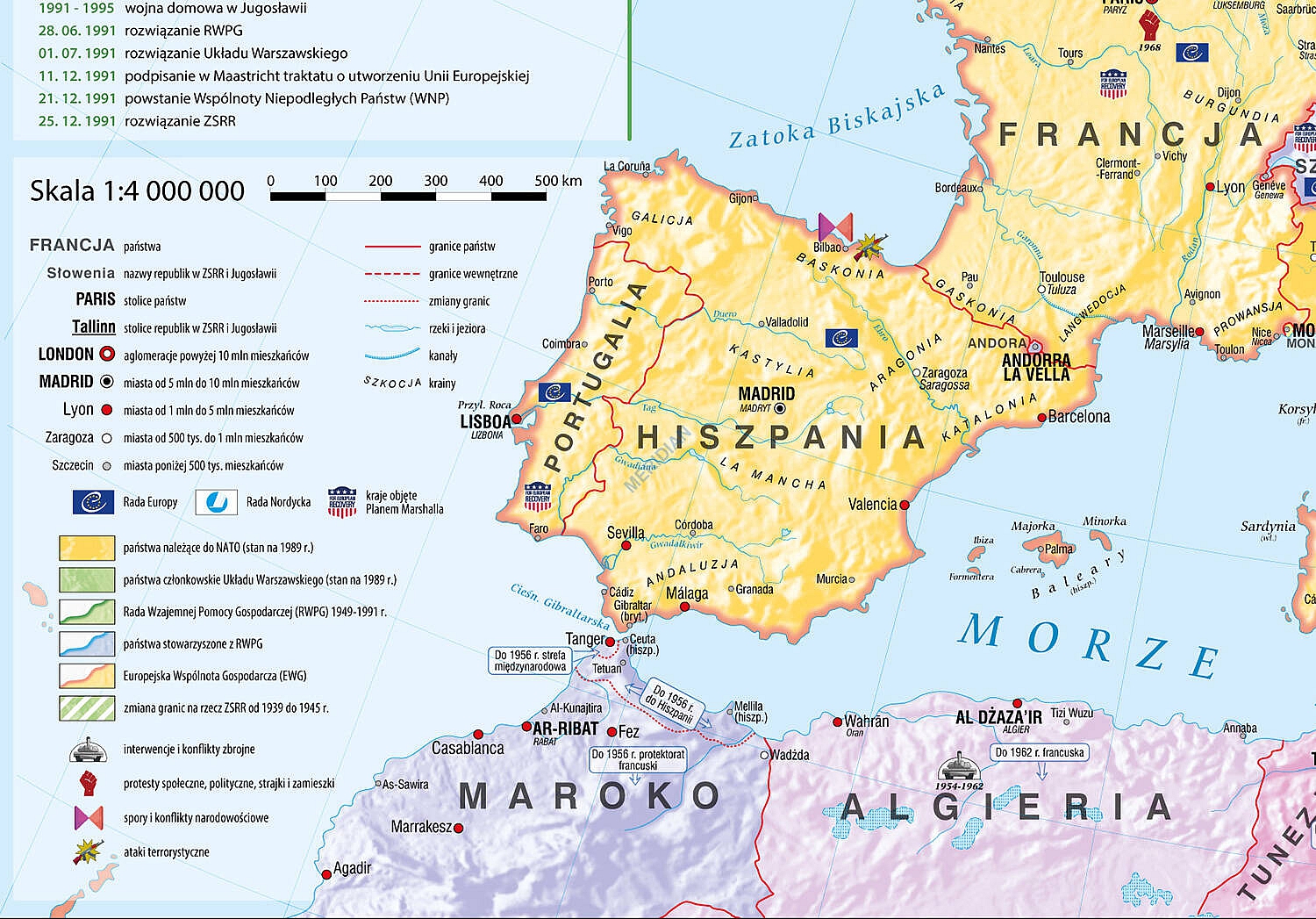 Szkolna mapa ścienna przedstawiająca Europę po roku 1945, skomplikowaną sytuację polityczną zaistniałą po drugiej wojnie światowej - podział na dwa bloki polityczne oraz powstanie "żelaznej kurtyny". Mapa przekrojowo ujmuje burzliwe i złożone zagadnienie powojennego pięćdziesięciolecia: interwencje i konflikty zbrojne, ruchy separatystyczne, konflikty narodowościowe, towarzyszące im protesty społeczne, strajki i zamieszki oraz ataki terrorystyczne.