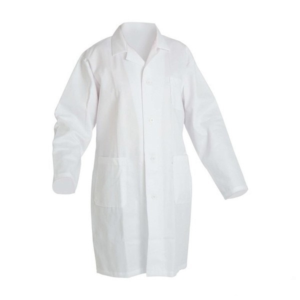 Fartuchy z białego płótna (100% bawełna) z długimi rękawami, trzema kieszeniami, paskiem regulującym obwód oraz zapinane na guziki.