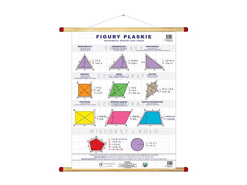 Figury płaskie: rozpoznawanie, własności, pola i obwody to wielkoformatowa plansza dydaktyczna. Szerokość 120 cm. i wysokość 160 cm. Jest to jedna z największych formatowo plansz dostępnych na rynku pomocy dydaktycznych, która wyjątkowo syntetycznie ujmuje podstawowe zagadnienia związane z geometrią figur płaskich. Przy każdej z figur znajduje się hasłowy – opis podstawowych jej właściwości, stanowiący zaczyn do wnikania w świat geometrycznych aksjomatów poprzez oznaczanie, wierzchołków wyznaczanie wysokości identyfikowania kątów czy wyprowadzania przekątnych. Najważniejszą wartość dydaktyczną, stanowią wzory matematyczne na obliczanie pól powierzchni poszczególnych figur płaskich oraz metod mierzenia długości ich obwodów. U dołu planszy znajduje się legenda – zbiór wszystkich symboli pojawiających się w treści planszy przy poszczególnych figurach geometrycznych rozszerzona o wykaz jednostek miar długości oraz jednostek pól powierzchni w zestawieniu z używanymi powszechnie skrótami tychże parametrów. Plansza jest wyposażona w linkę zawieszającą a więc po rozwinięciu jest gotowa do zawieszenia – eksponowania. Para sznurków w górnym wałku ułatwia przechowywanie w stanie zwiniętym. Nadruk treści na tkaninie banerowej – wyjątkowo trwały. Dlatego oprawa planszy w półwałki drewniane w systemie WDS – daje możliwość udzielenia 10 lat gwarancji jakości. Powierzchnia planszy, zmywalna, nie daje odbić światła oraz mechanicznie nie zagina się tak trwale jak to ma miejsce w przypadku plansz foliowanych. Można ją eksponować i nie traci na czytelności, nawet w miejscach o bardzo dużym nasłonecznieniu. Planszę zwiniesz, rozwiniesz, zawiesisz jak klasyczną mapę. Końcówki wałków zabezpieczone zatyczkami – dodatkowo skręcanymi wzdłużnie.