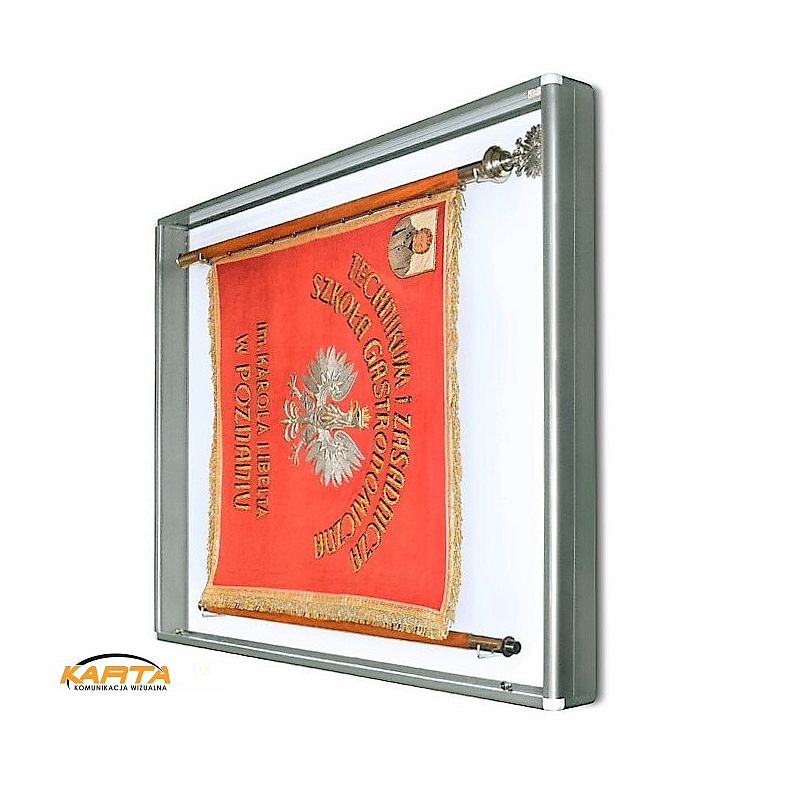Gablota na sztandar wykonana z w całości z aluminium anodowanego na srebrno lub malowanego na złoto, zabezpieczone lakierem bezbarwnym przed czernieniem. Narożniki gabloty plastikowe. Drzwi - bezpieczne szkło akrylowe w ramie aluminiowej unoszone do góry, zamykane na dwa zamki. Tło białe. W zestawie haki do zamontowania sztandaru z drzewcem i drugiej części drzewca. Głębokość 10cm, przestrzeń użytkowa 7cm.