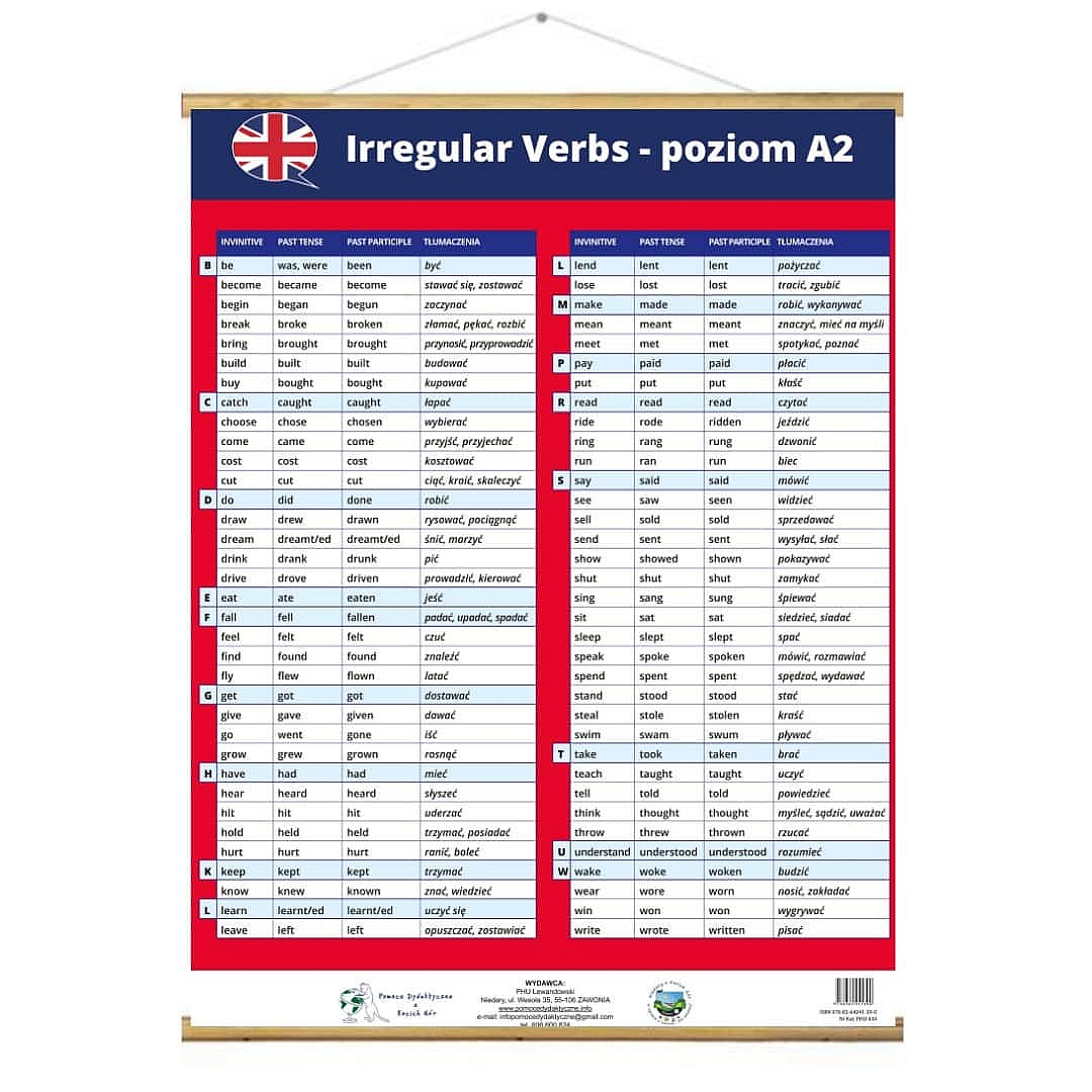 Niech Irregular Verbs – Czasowniki nieregularne angielski w formie 120×160 cm planszy plakatowej stanie się Twoim niezawodnym przewodnikiem podczas opanowywania nieregularnych czasowników. Dzięki tej rozbudowanej i estetycznej formie nauka stanie się jeszcze bardziej skuteczna, przyjemna i inspirująca.