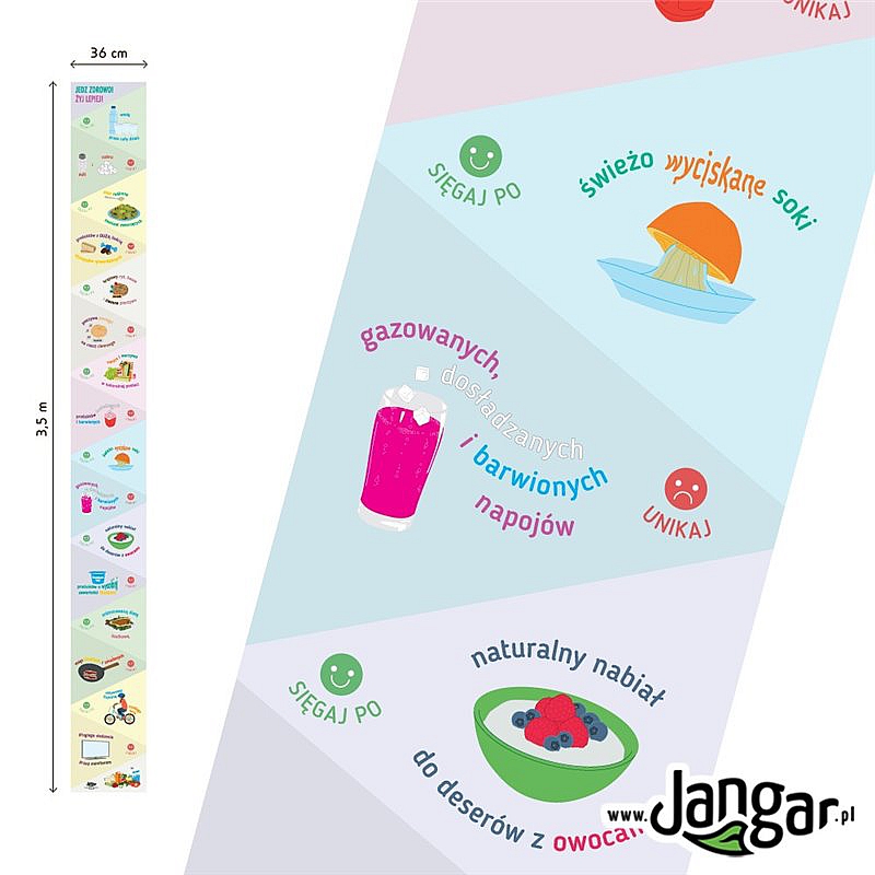 Odporna mata podłogowa długości 3,5 m i szerokości 36 cm prezentująca w żywy i obrazowy sposób jak zdrowo się odżywiać, co należy jeść, aby być zdrowym, a czego unikać i czym zastępować. Mata została opracowana w oparciu o aktualną wersję piramidy zdrowego żywienia i aktywności fizycznej dla uczniów, czyli dzieci i młodzieży w wieku szkolnym na podstawie zaleceń Instytutu Żywności i Żywienia w Warszawie ogłoszonych w 2016 roku oraz najnowszych zaleceń WHO (Światowej Organizacji Zdrowia). Zawiera też zalecenia związane z aktywnością fizyczną. Mata zawiera sympatyczne, rysunkowe zalecenia dotyczące zdrowego odżywiania oznaczone znanymi dzieciom ikonkami-buźkami (emotikonkami) i opisem: "SIĘGAJ PO" (np. ...owoce i warzywa w naturalnej postaci; ...oleje roślinne zamiast zwierzęcych); "UNIKAJ" (np. ...produktów dosładzanych i barwionych; ...pieczywa jasnego na rzecz ciemnego; itd.). Mata jest kolorowa i czytelna, pokryta specjalnym transparentnym laminatem podłogowym bardzo odpornym na ścieranie. Tę pomoc dydaktyczną można mocować lub rozkładać na podłodze lub innych płaskich powierzchniach. Można ją także na stałe przytwierdzać do podłogi tak jak wykładzinę, używając do tego dwustronnej taśmy do wykładzin. Matę można przechowywać także w formie zwiniętej.