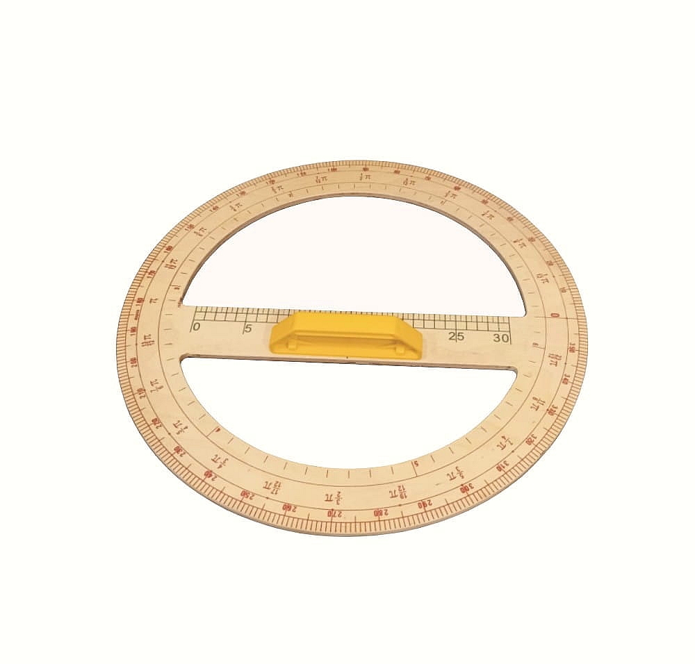 Kątomierz kołowy jest to przyrząd tablicowy do odmierzania kątów. Skala w stopniach (0-360), radianach oraz wzajemnej zależności- naniesiona na obrzeżach kątomierza- pozwala na przeprowadzenie zadań matematycznych- demonstracyjnych na tablicy szkolnej. Na poziomej poprzeczce znajduje się skala metryczna.