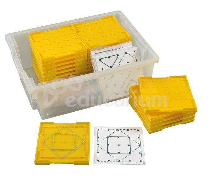 Ekonomiczny zestaw geoplanów dla całej klasy wraz z kartami pracy w poręcznym pudełku. Geoplany są dwustronne: z jednej strony - siatka 5 x 5, a z drugiej - 24-punktowy okrąg. Karty zadaniowe pogrupowane w cztery serie (każda po dwa komplety) umożliwiają obiegowe wykonywanie zadań (każdy uczeń dostaje jedną kartę, a po wykonaniu zadania przekazuje go koledze zgodnie z ustalonym kierunkiem).