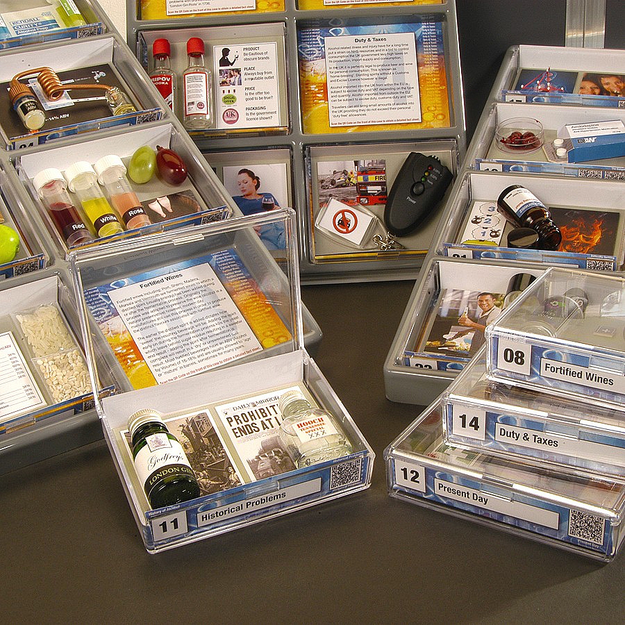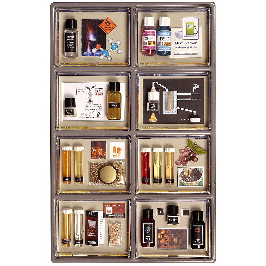 Trwała i zamykana walizka transportowa zawiera trzy tace, w których znajdują się 24 przezroczyste pudełka zawierające poszczególne elementy. Omówionych jest sześć głównych tematów: 1. Co to jest alkohol? (Taca pierwsza górna) 2. Rodzaje alkoholu (taca dolna) 3. Historia alkoholu (górna taca druga) 4. Kontrolowanie alkoholu (dolna tacka druga) 5. Zagrożenia dla zdrowia (górna półka trzecia) 6. Rozwiązania (dolna taca trzecia).