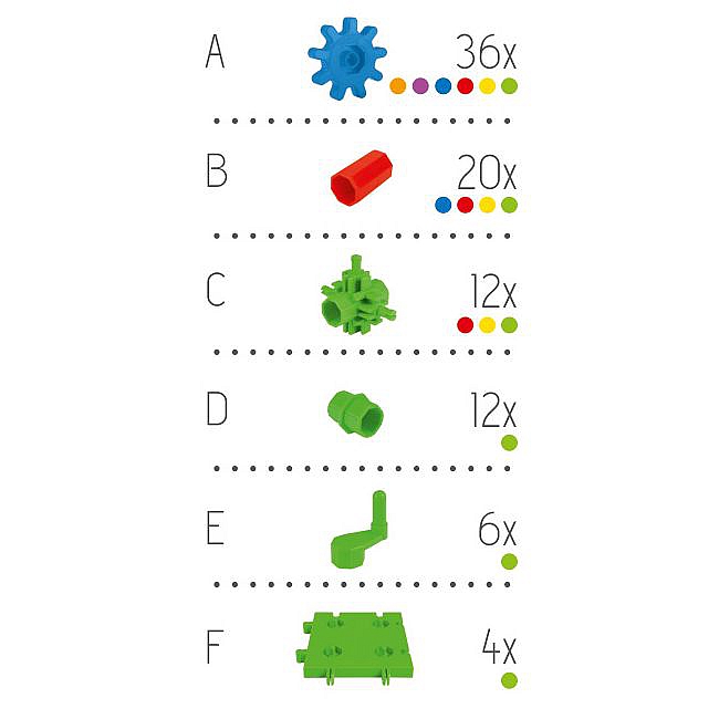 Zaproponowana ilość elementów w zestawie jest tak dobrana, aby zapoznać użytkownika z ideą kół zębatych - jak poruszają nawet odległe elementy.