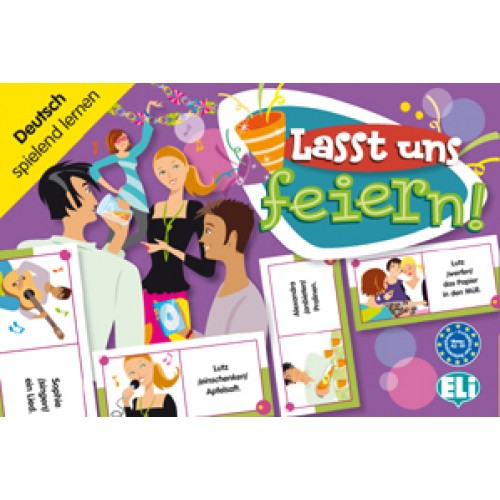 Lasst uns feiern! - gra językowa składająca się z 48 kart podzielonych na pół: na jednej połowie znajdują się ilustracje, a na drugiej tekst w języku włoskim. Dokładając kolejne karty domina należy pamiętać aby obrazek odzwierciedlał zapis słowny. Gracz, który ułoży kartę musi odczytać znajdujące się na niej czasownik w formie przyszłej, przeszłej i teraźniejszej.