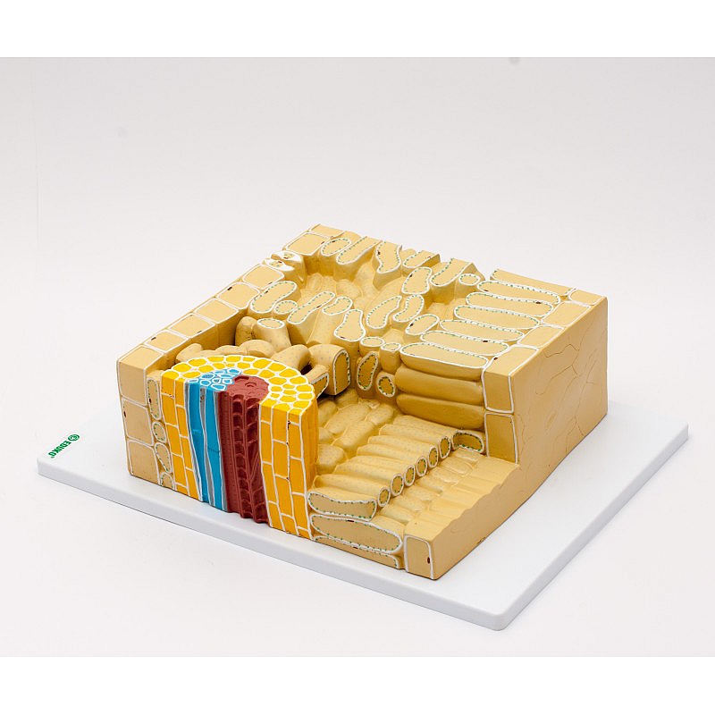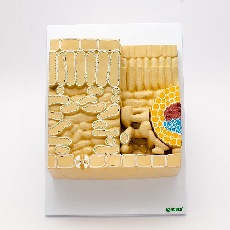 Duży, przestrzenny model liścia firmy EDUKO doskonale obrazuje budowę tkankową w tym organie i układ warstw poszczególnych komórek. Wyraźnie widać skórkę z aparatem szparkowym, miększe palisadowy i gąbczasty, komórki pochwy wokółwiązkowej. Kolorowo wyróżniony został przekrój wiązki przewodzącej z widocznym rozróżnieniem na drewno i łyko. Model dokładnie przedstawia trójwymiarową morfologię organu - widoczny jest zarówno przekrój poprzeczny jak i podłużny liścia. Model stanowi niezbędną pomoc dydaktyczną w pracowniach biologicznych i botanicznych.