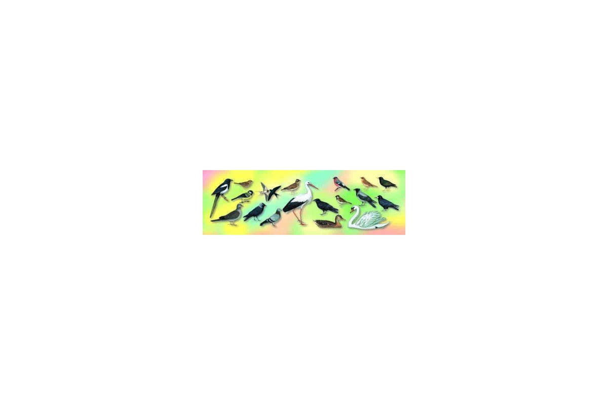 • gawron, • kruk, • wrona, • kawka, • szpak, • łabędź, • bocian, • sójka, • jaskółka, • sikora, • wróbel - samica, • wróbel - samiec, • kaczka krzyżówka - samica, • kaczor - samiec, • gołąb siniak, • gołąb sierpówka, • skowronek, • gil, • sroka, • słowik,