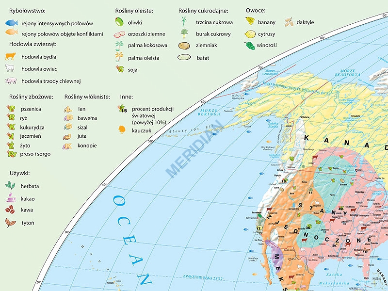 Gospodarcza mapa tematyczna przedstawiająca strukturę użytkowania ziemi na świecie. Na tym tle sygnaturami ukazane jest rozmieszczenie upraw istotnych ekonomicznie roślin, hodowli zwierząt gospodarczych oraz rybołówstwa. Główni producenci opisani są wartościami procentowego udziału w produkcji światowej.