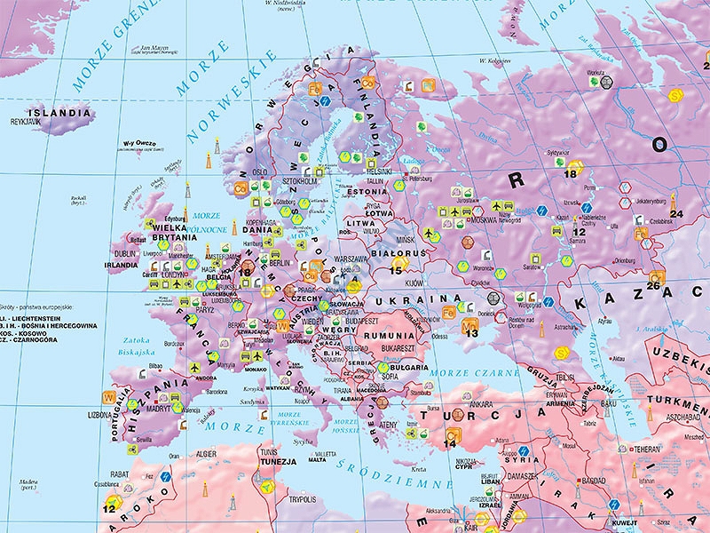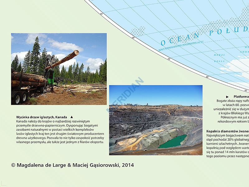 Czytelne sygnatury ułatwiają korzystanie z mapy, a główni producenci opisani są wartościami procentowego udziału w produkcji światowej. Mapa została wzbogacona dodatkowo o zdjęcia ilustrujące przykładowe zagadnienia.
