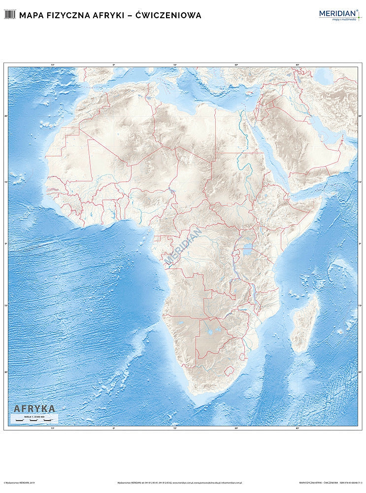 Ścienna, ćwiczeniowa mapa szkolna zawierająca konturowe obrysy granic administracyjnych państw i terytoriów zależnych Afryki oraz sieć hydrograficzną na tle reliefu ukształtowania powierzchni ziemi.