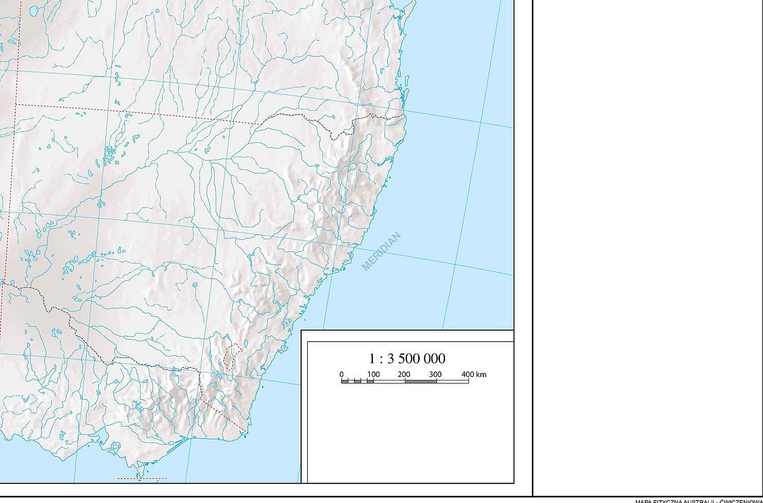 Ścienna, ćwiczeniowa mapa szkolna zawierająca konturowe obrysy granic administracyjnych państw, prowincji i terytoriów Australii oraz sieć hydrograficzną na tle reliefu ukształtowania powierzchni. W panelu bocznym jest miejsce przeznaczone na własne notatki, które można robić pisakiem wodnozmywalnym.