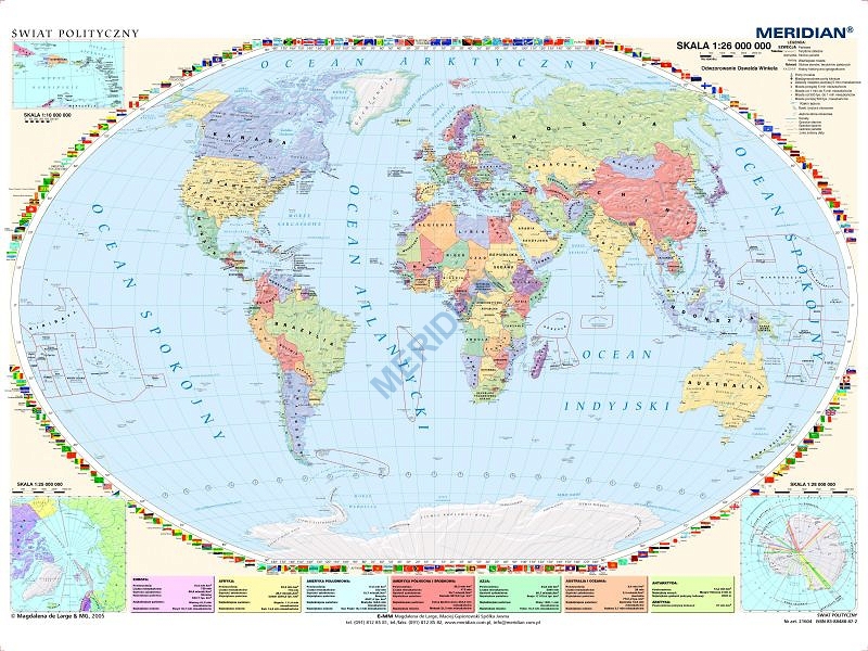 Ścienna mapa polityczna świata aktualizowana na rok 2023. Ukazuje aktualną sytuację polityczną świata, granice państw, granice sporne, a także granice stanów, prowincji i terytoriów. Mapa wzbogacona jest flagami państw oraz informacjami geograficzno-demograficznymi dla każdego kontynentu. W kartonach bocznych umieszczone są następujące mapy: