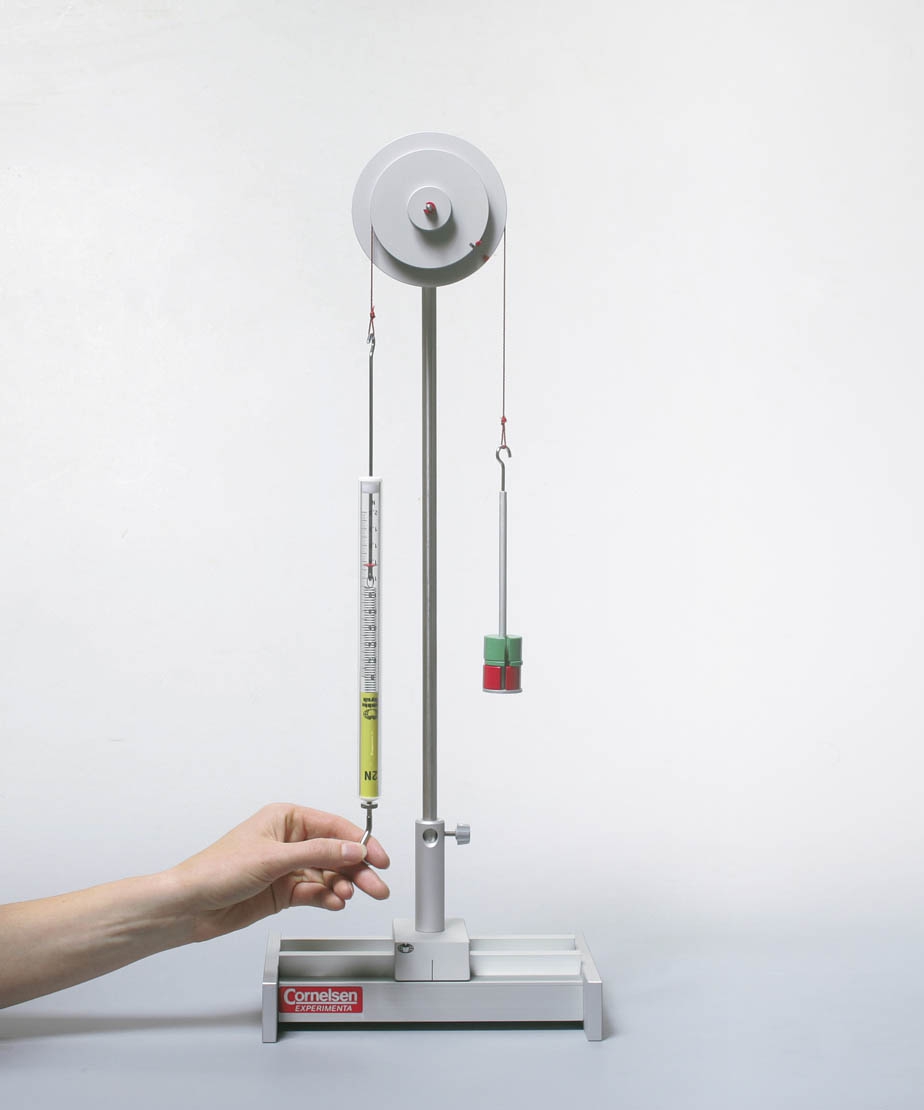 Przystępny zestaw demonstracyjny do pokazów z mechaniki, zawierający m.in. bloczki, szalki, sprężyny z haczykami, dynamometr, obciążniki, równię, skalę, zaciski i inne elementy.