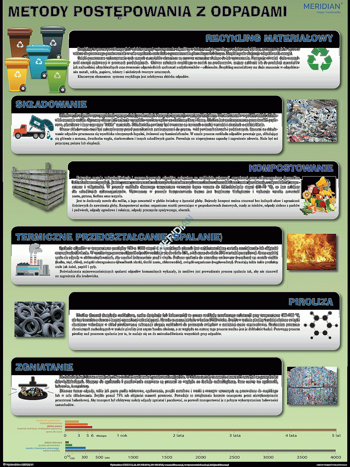 Ścienna plansza szkolna do przyrody, biologii, ekologii i techniki przedstawiająca metody postępowania z odpadami oraz najważniejsze sposoby ich unieszkodliwiania. Informacje te uzupełnione są linią czasową naturalnej degradacji przykładowych odpadów.