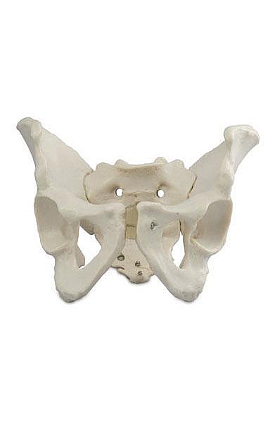 Naturalnych rozmiarów kompletny szkielet miednicy męskiej (kość kulszowa, kość biodrowa, kość łonowa, kość krzyżowa) ze spojeniem łonowym i kością ogonową, wykonany z masy plastycznej.