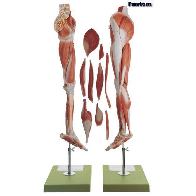 Model nieznacznie mniejszy od wymiarów naturalnych, wykonany z SOMSO-Plastu. Na modelu lewej nogi przedstawiono najważniejsze partie mięśni, naczyń krwionośnych i nerwów.