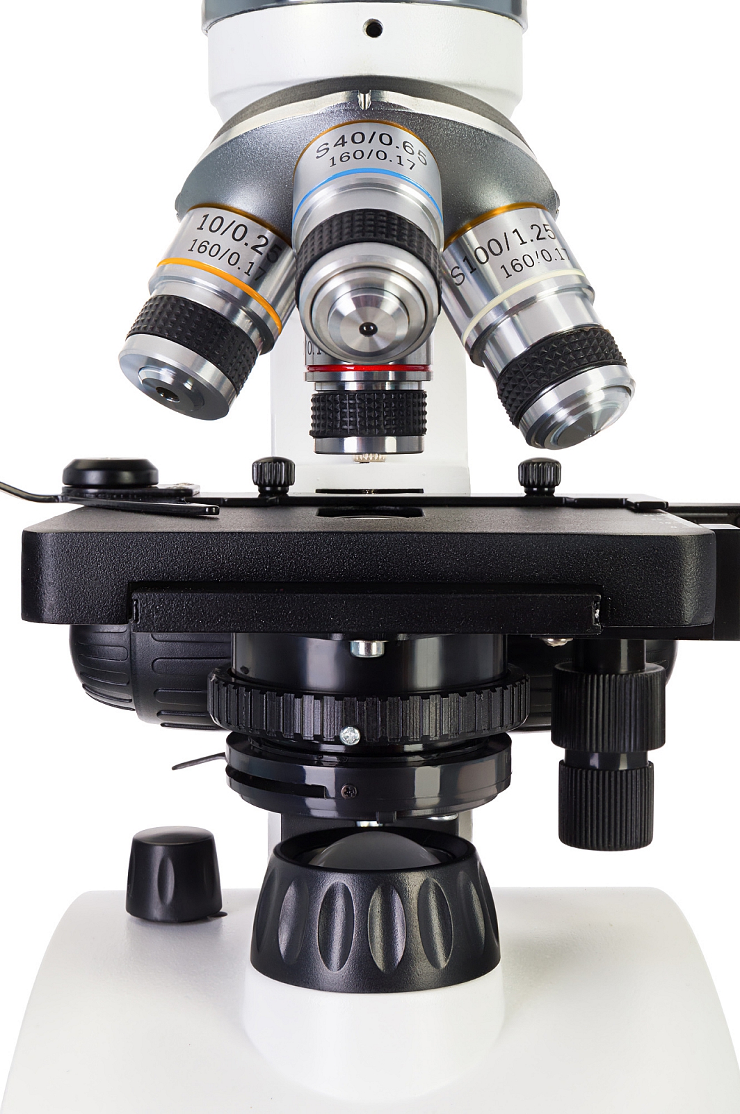 Stolik mikroskopu ma skalę mechaniczną zwiększającą wygodę użytkowania. Pod stolikiem zamontowano kondensor Abbego z przysłoną irysową oraz uchwyt na filtr światła. Układ oświetlenia składa się z dwóch elementów: oświetlenia górnego i dolnego o regulowanej jasności. Oświetlenie może być zasilane za pomocą baterii lub zasilacza sieciowego (baterie i zasilacz są częścią zestawu).