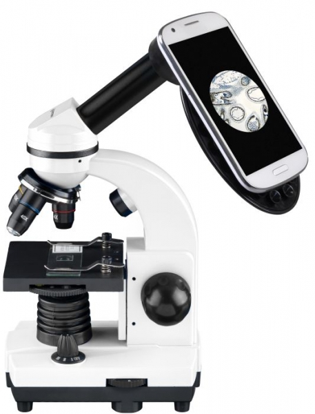 Mikroskop wyposażono także w fotoadapter do smartfonów umożliwiający wykonywanie zdjęć i nagrywanie filmów z użyciem smartfonów.