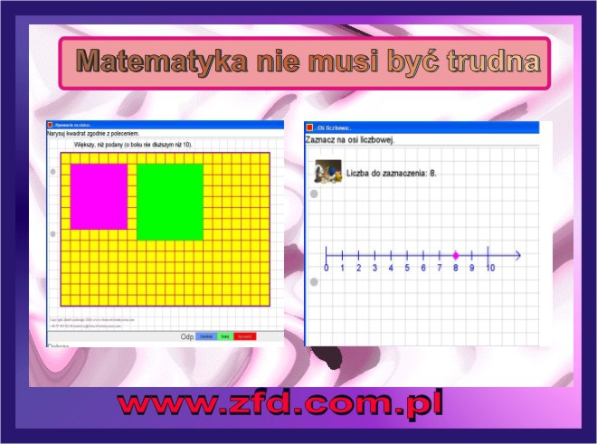 Program przeznaczony jest dla uczniów szkoły podstawowej ze specyficznymi trudnościami matematyki. Podstawowe rodzaje ćwiczeń: klasyfikacja, słowne zapisywanie liczb, zaznaczenie liczb na osi liczbowej. Interpretacja sumy i różnicy na osi liczbowej. Rysowanie kwadratów o zadanym boku (długość boku jest liczbą naturalną), zadanym polu (będącym kwadratem liczby naturalnej), i zadanym obwodzie. Rysowanie kwadratu o polu mniejszym (lub równym, większym) od wzorca (ćwiczenie relacji większości mniejszości). Rysowanie prostokątów o zadanych bokach (długości boków są liczbami naturalnymi). Rysowanie wybranego prostokąta o zadanym polu, którego boki są liczbami naturalnymi. Rysowanie wszystkich prostokątów o zadanym polu, którego boki są liczbami naturalnymi (ćwiczenie tabliczki mnożenia). Ćwiczenia z zakresu dziesiątkowego systemu pozycyjnego (przestawianie liczby zgodnie z semantyką tego zapisu np. 2346 = 2*1000+3*100+4*10+6*1). Równania z kratką, w którą uczeń ma wpisać brakującą liczbę. Rodzaje działań: dodawanie, odejmowanie, mnożenie. Wszystkie działania są wykonywalne w zbiorze liczb naturalnych. Proste równoległe, przecinające się, prostopadłe Dokładny spis ćwiczeń: