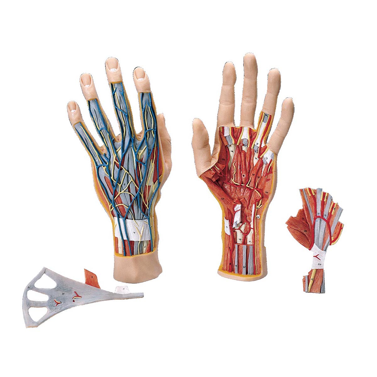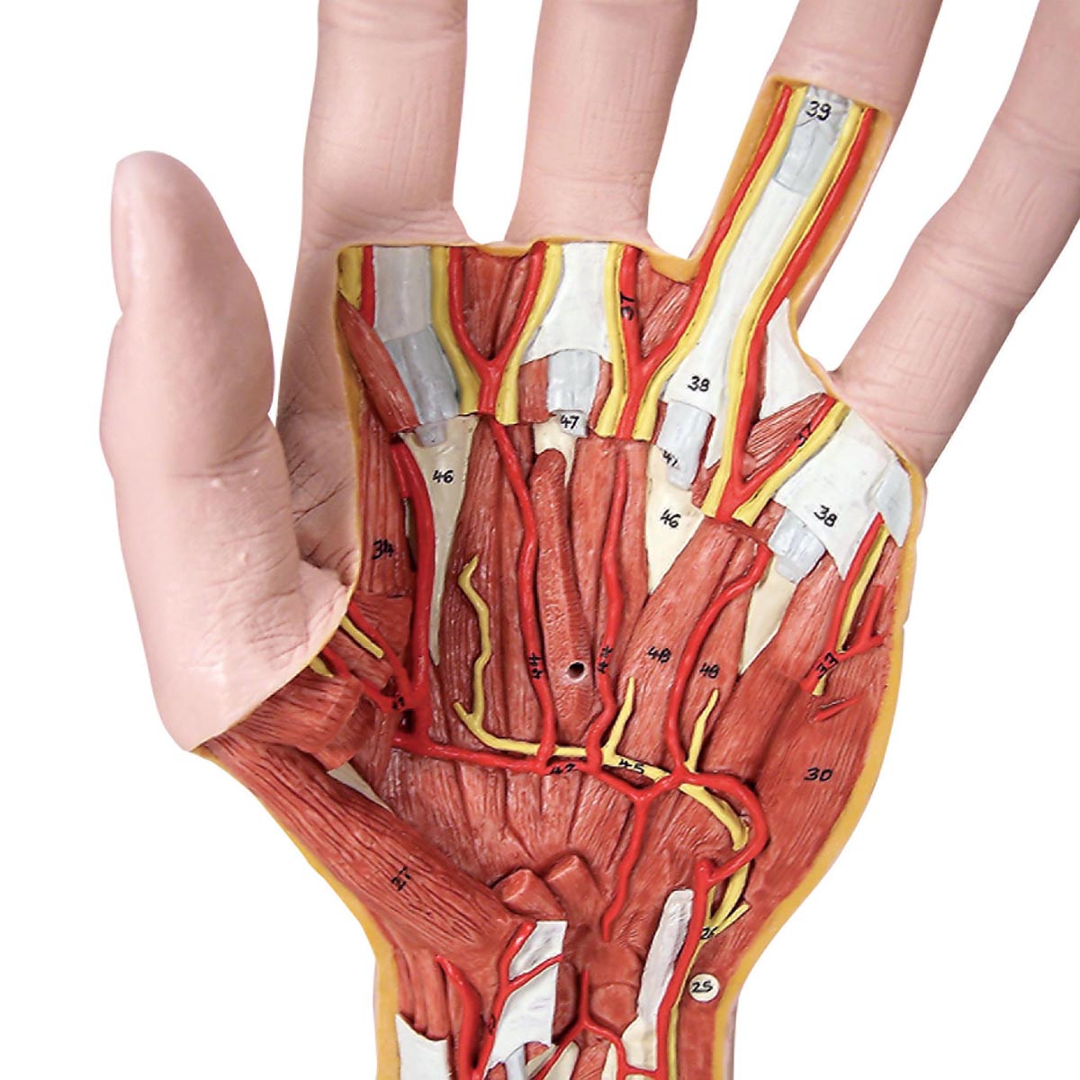 2) powierzchowne i głębokie struktury ludzkiej dłoni włącznie z kośćmi, mięśniami, ścięgnami, więzadłami, nerwami i tętnicami (łuk dłoniowy powierzchowny i głęboki)