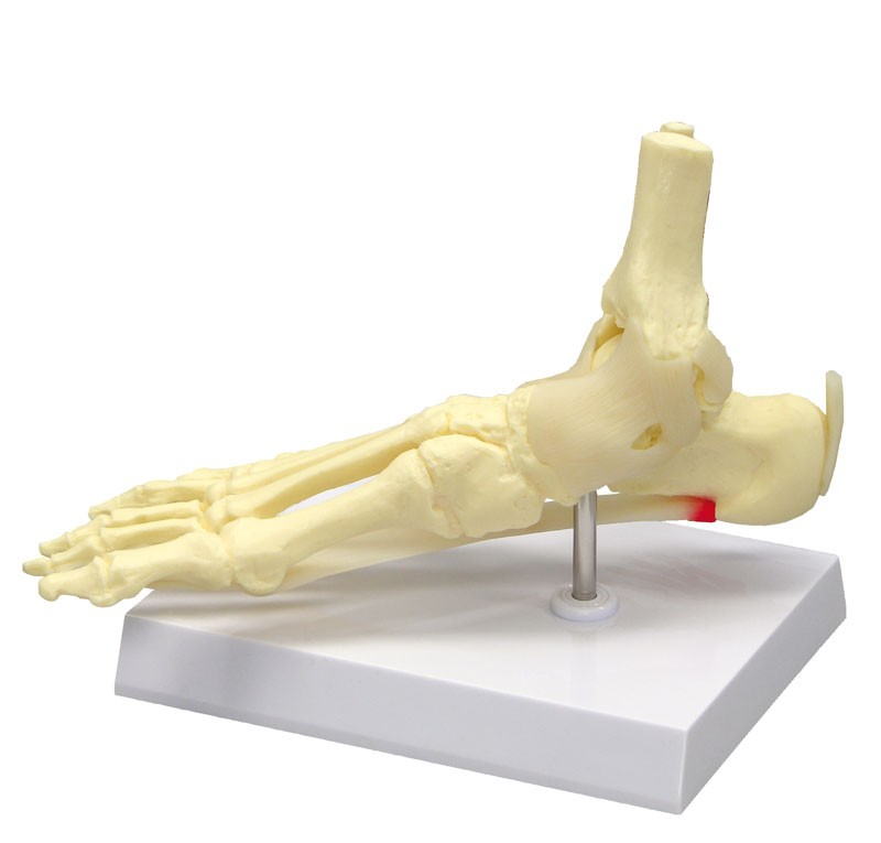 Model naturalnych rozmiarów prezentujący kości stopy, stawu skokowego i podudzia. Model zawiera również ścięgno Achillesa, więzadło poboczne, rozcięgno podeszwowe oraz więzadło piętowo-łódkowate z zapaleniem powięzi podeszwy.
